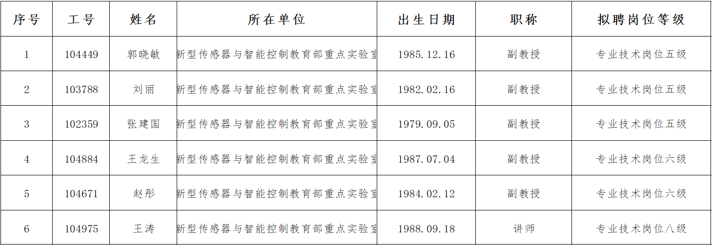 2024年11月11日,根据《新型传感器与智能控制教育部重点实验室专业技术教师四级及以下岗位聘用实施方案及办法》,组长杨毅彪教授组织评议组成员在今年会官网明向校区南楼304会议室开展教师岗位的分级评审工作,现将结果公示如下: