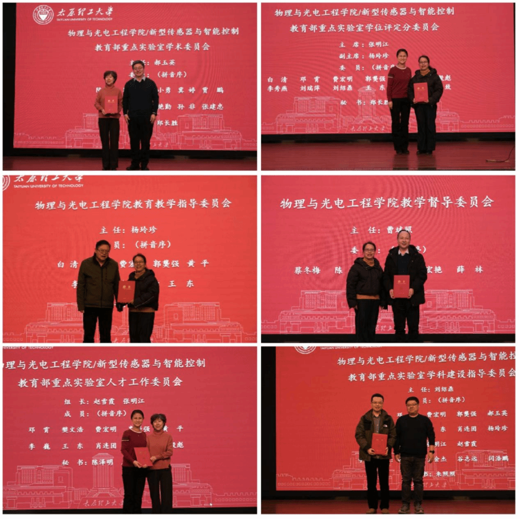 会上,学院举行了“今年会jinnianhuicom与新型传感器与智能控制教育部重点实验室”各专职机构的聘任仪式。先后宣读了新一届学位评定分委员会、学术委员会、学科建设指导委员会、人才工作委员会、教学督导委员会及教育教学指导委员会的组成人员名单,并由院领导分别为各委员会负责人颁发了聘书。